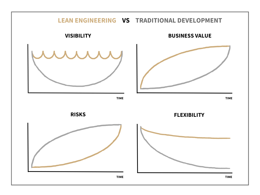 Lean Engineering prevents the above-mentioned risks through, among others, consistent prototyping, narrowing the development cycle, strategic collaboration, and implementing scrum.